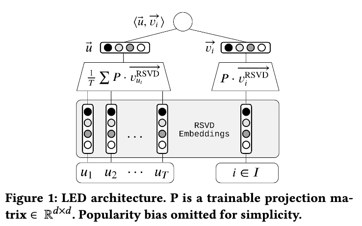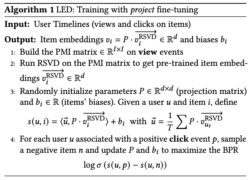 From these principles, we derived a simple yet powerful approach. The model has few parameters, one embedding and one bias per item. It encodes each user timeline to derive the user representation via a simple average. Item embeddings are pre-trained using a large-scale randomized SVD library that Criteo open-sourced a few years before (spark-rsvd). The following figure summarizes the algorithm. How much simpler could it be? :)