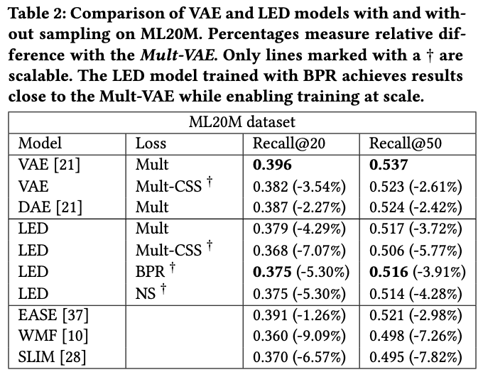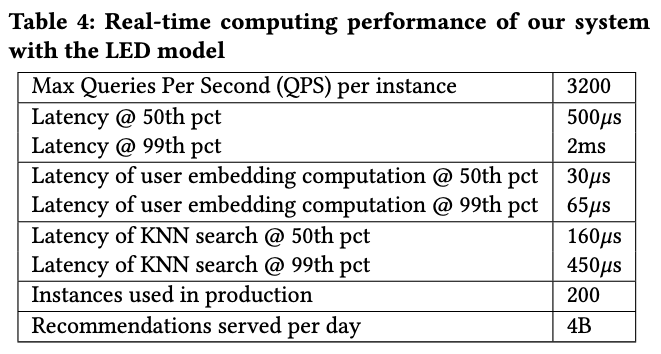This is what makes LED so efficient, allowing us to train the model in a few hours for millions of items and billions of users and to serve billions of requests per day. Below are the performance numbers per instance. The paper provides details about how we achieved this speed.