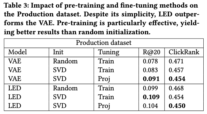 First, we evaluated our method in production. We noticed that LED was performing better than all other methods, including the VAE mentioned above. This could be explained by the difference in nature and distribution between a real-world dataset and ML20M.